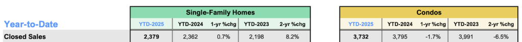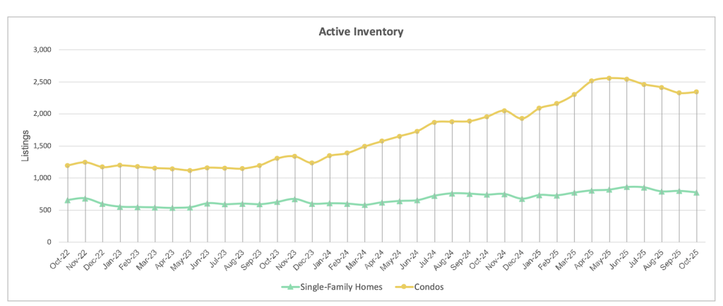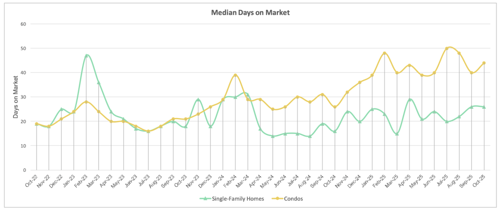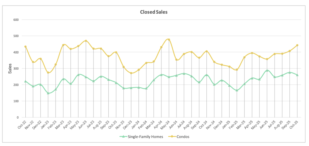 2025年10月期の成約価格中央値は、戸建・コンドミニアムともに前月比・前年比いずれも増加となりました。コンドミニアムは今年1月以降で最も高い数値を記録しています。このまま高水準を維持したまま、2025年終盤を迎えられると良いですね。