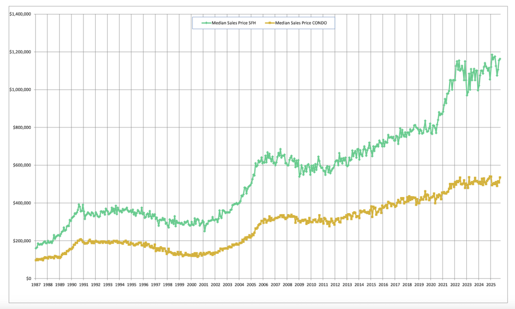 グラフ1:オアフ島不動産-成約価格中央値(1987年9月〜2025年10月)