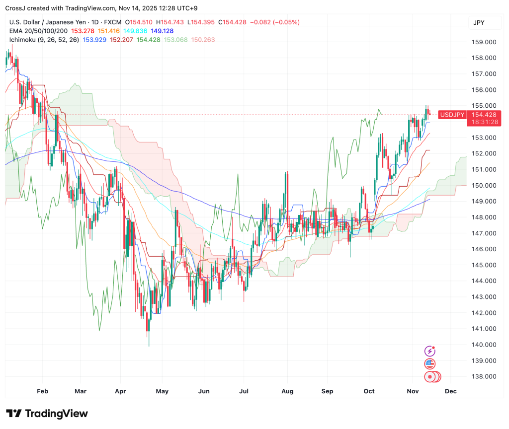 2025年11月期のUSD/JPY為替は、先月からさらに上昇傾向が続き、再び154円台まで上昇しています。今年夏頃の140円台前後とは打って変わり、2025年終盤には再び150円台後半に乗る勢いを見せています。アメリカでは、先月まで43日間にわたって続いていた政府の一部閉鎖がようやく終了し、今後の経済体制の改善に期待が高まります。ただし、閉鎖終了後も国内の航空便遅延や人員不足の問題はしばらく続く見込みです。