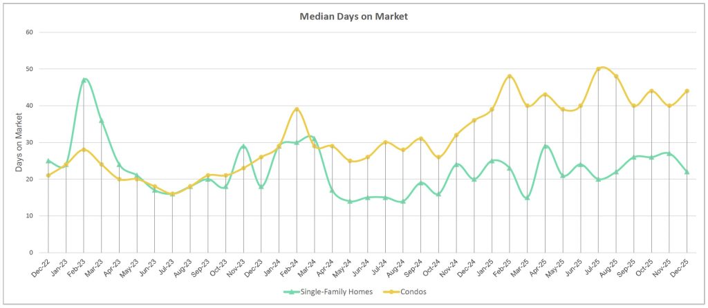 4. 買い手がつくまでの日数(Days on Market)中央値:戸建は短縮、コンドは長期化が目立つ