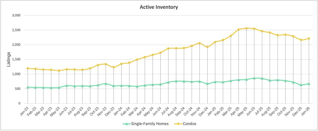 在庫水準を見ると、戸建では前年よりやや減少している一方、コンドミニアムでは供給量が増えている状況が続いています。コンド市場では選択肢が増えていることから、買い手側がより慎重に比較検討を行う環境となっています。