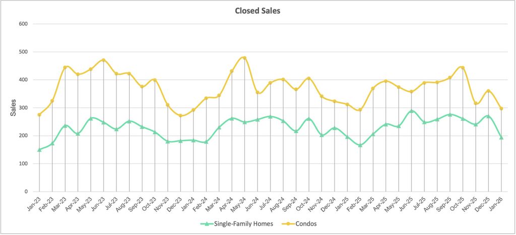 グラフ2:オアフ島不動産-取引件数(2023年1月〜2026年1月)