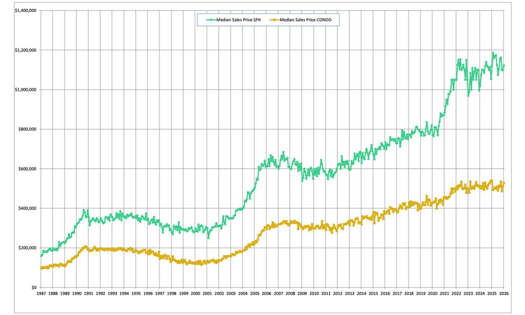 グラフ1:オアフ島不動産-成約価格中央値(1987年1月〜2026年1月)