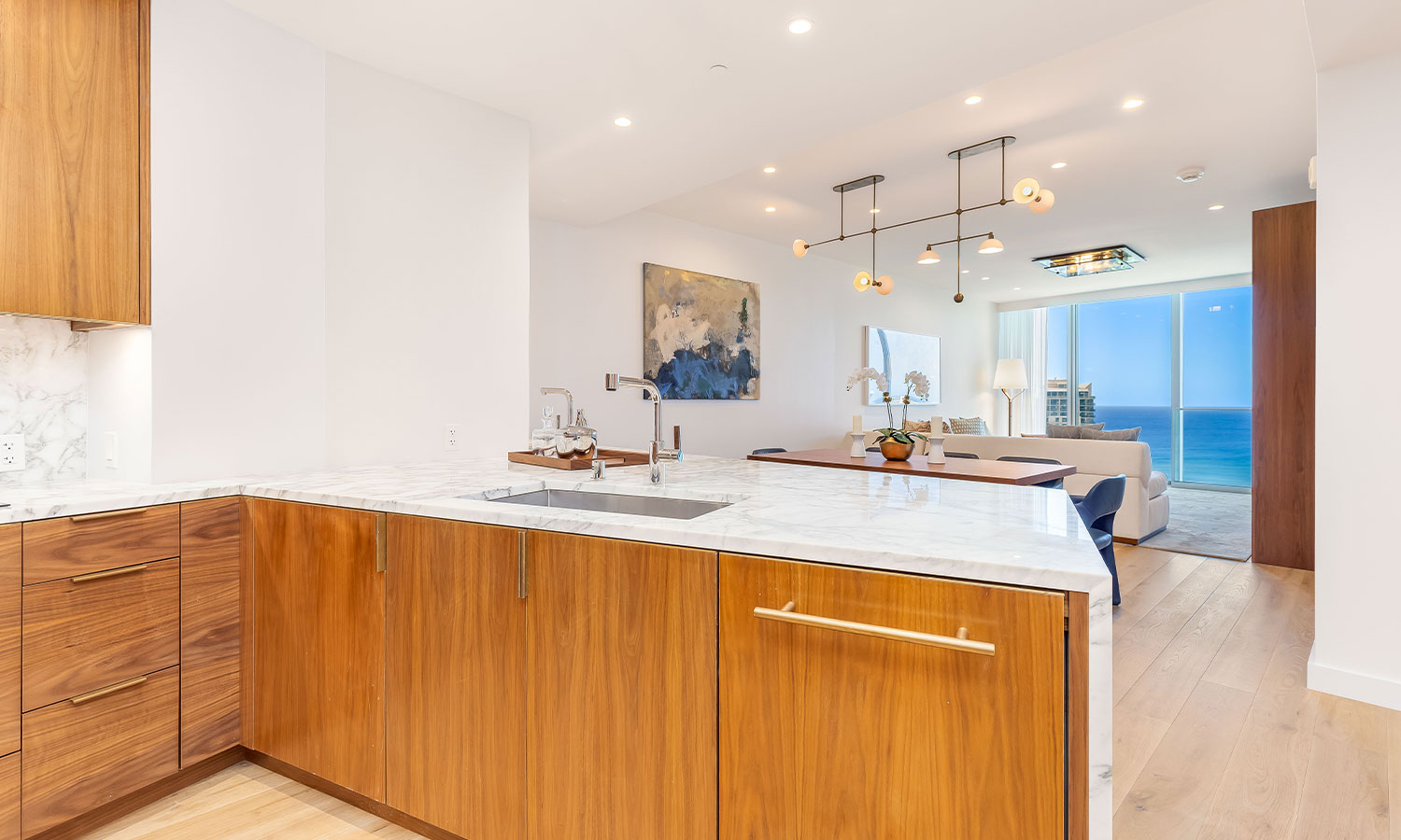 大理石のカウンターとウォールナットのキャビネットが調和した上質なキッチン。
