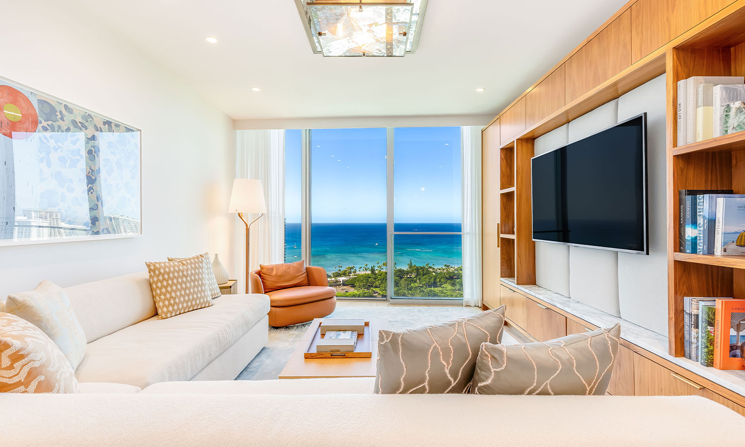 全面の窓から柔らかな日差しが差し込み、ワイキキの美しい海を一望できるリビングルーム。